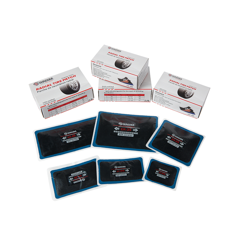 SUNSOUL vulcanizing tire patches work on cars, trucks, bicycles, and motorcycles. The patches fit both tubeless and tube-type tires. Technicians choose the right size for each repair.